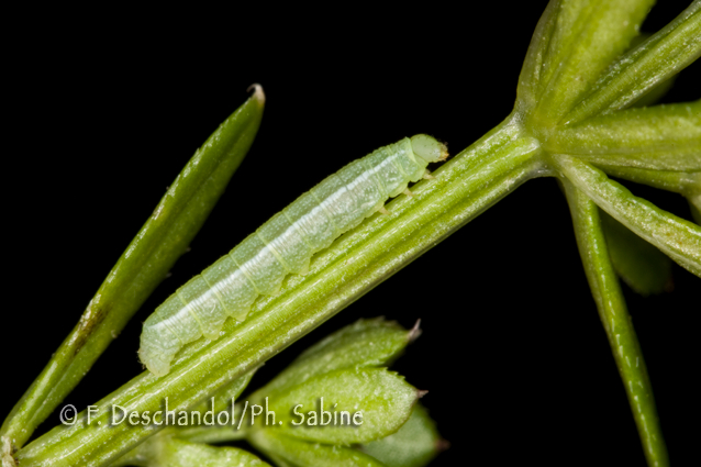 : Petit Sphinx de la Vigne (Deilephila porcellus), chenille 1er stade, Ulm, Allemagne.