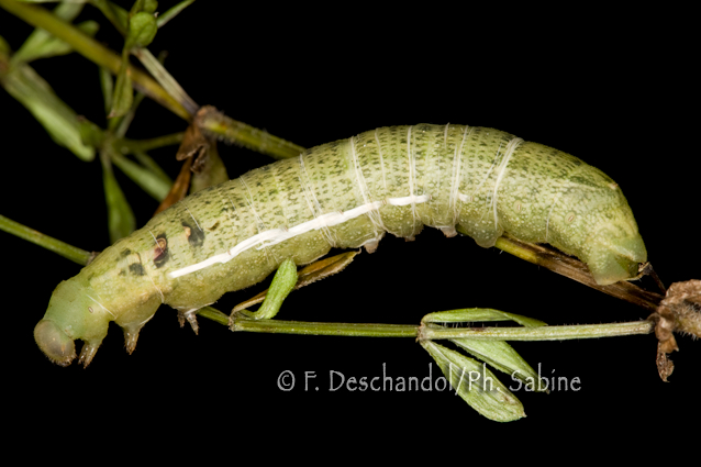 : Petit Sphinx de la Vigne (Deilephila porcellus), chenille 4ème stade, mue proche, Ulm, Allemagne.