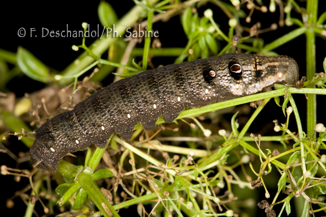 : Petit Sphinx de la Vigne (Deilephila porcellus), chenille 5ème stade, forme brune, Ulm, Allemagne.