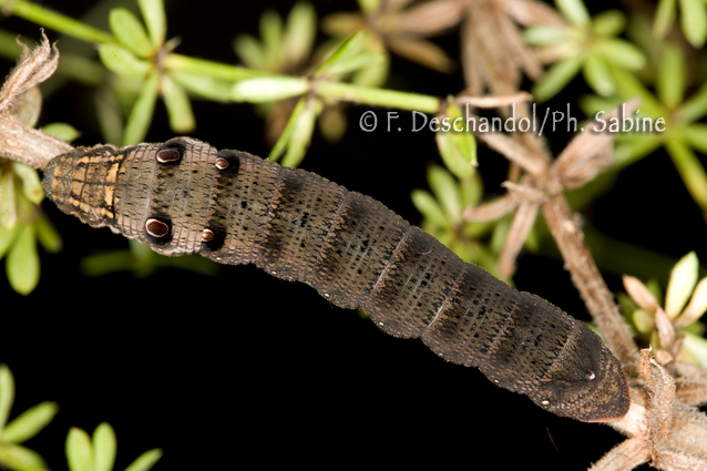 : Petit Sphinx de la Vigne (Deilephila porcellus), chenille 5ème stade, forme brune, Ulm, Allemagne.