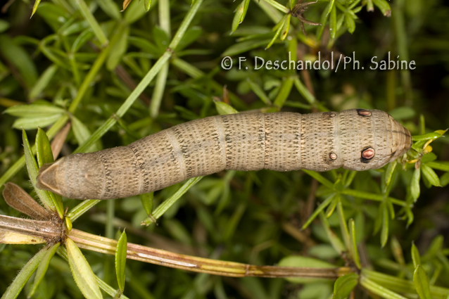 : Petit Sphinx de la Vigne (Deilephila porcellus), chenille 5ème stade, variante de forme brune, UK.
