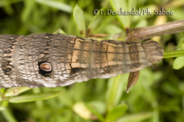 : Petit Sphinx de la Vigne (Deilephila porcellus), chenille 5ème stade, forme brune, UK.