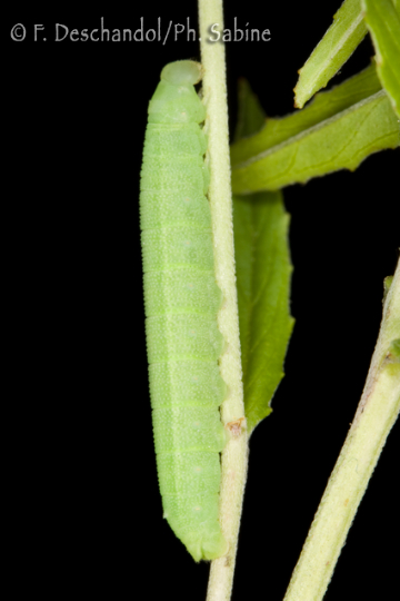: Sphinx de l'Epilobe (Proserpinus proserpina), chenille 3ème stade, mue proche, Baie de Seine (76), France.