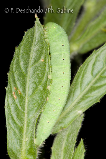 : Sphinx de l'Epilobe (Proserpinus proserpina), chenille 4ème stade, forme verte, Baie de Seine (76), France.