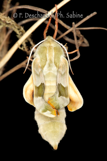 : Sphinx du Tilleul (Mimas tiliae), femelle à l'éclosion, Treillières (44), France.