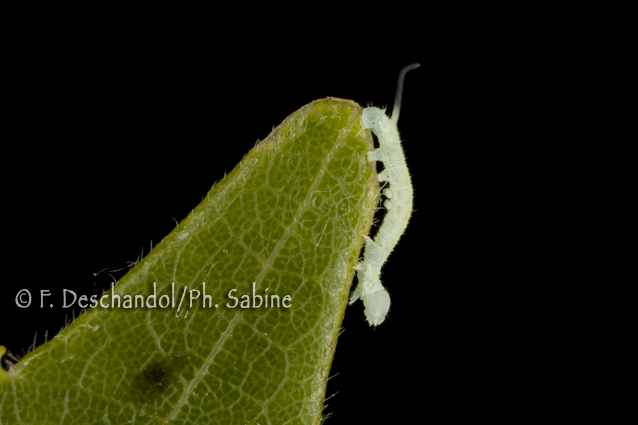 : Sphinx du Tilleul (Mimas tiliae), chenille 1er stade, Le Havre (76), France.