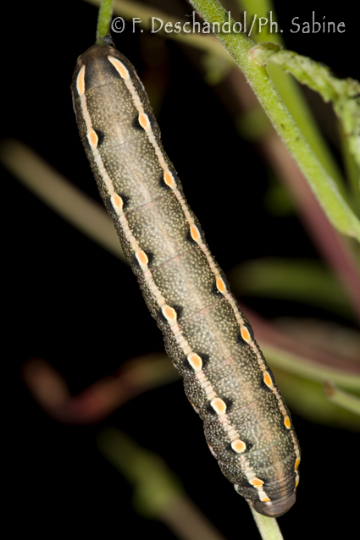 : Sphinx Chauve-Souris (Hyles vespertilio), chenille 4ème stade, forme sombre, Valais, Suisse.