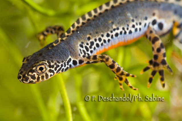 : Triton alpestre (Ichthyosaura alpestris alpestris), mâle, Forêt de Brotonne (76), France.