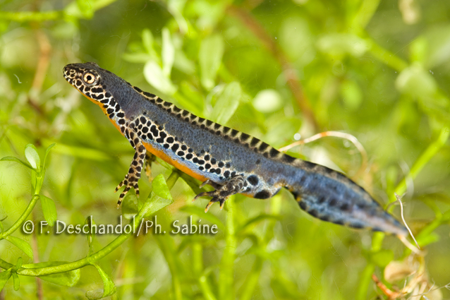 : Triton alpestre (Ichthyosaura alpestris alpestris), mâle, Forêt de Brotonne (76), France.