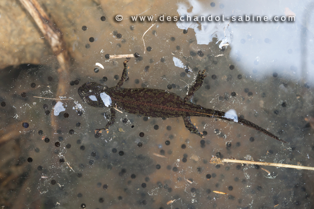 : Triton alpestre (Ichthyosaura alpestris alpestris), femelle dévorant des oeufs de Rana temporaria, Les Plans sur Bex, Suisse.