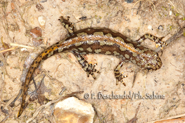 : Triton alpestre (Ichthyosaura alpestris alpestris), femelle, Forêt de Brotonne (76), France.