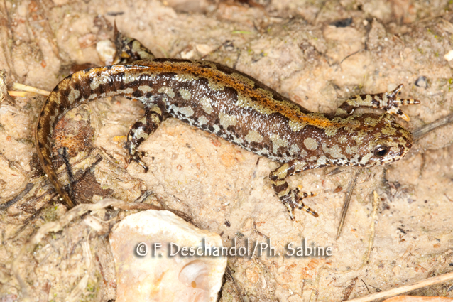 : Triton alpestre (Ichthyosaura alpestris alpestris), femelle, Forêt de Brotonne (76), France.