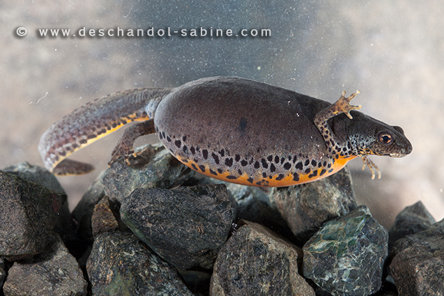: Triton alpestre (Ichthyosaura alpestris apuanus), femelle atteinte d'hydrops, Rallio, Italie.