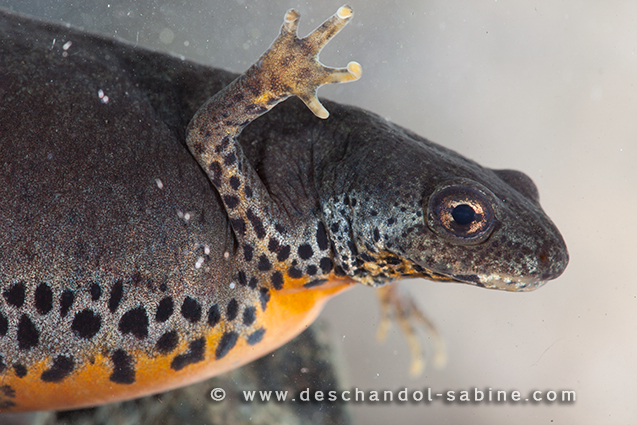 : Triton alpestre (Ichthyosaura alpestris apuanus), femelle atteinte d'hydrops, Rallio, Italie.