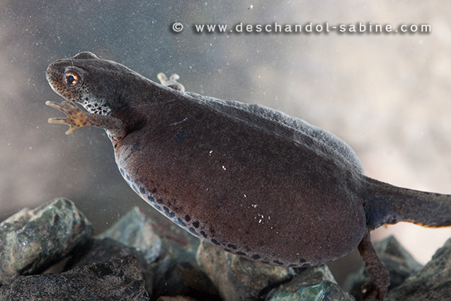 : Triton alpestre (Ichthyosaura alpestris apuanus), femelle atteinte d'hydrops, Rallio, Italie.