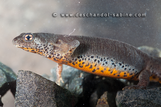 : Triton alpestre (Ichthyosaura alpestris apuanus), femelle, Rallio, Italie.