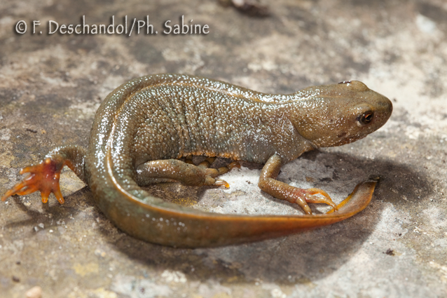 : Triton crêté italien (Triturus carnifex), femelle, Veigy (74), France.