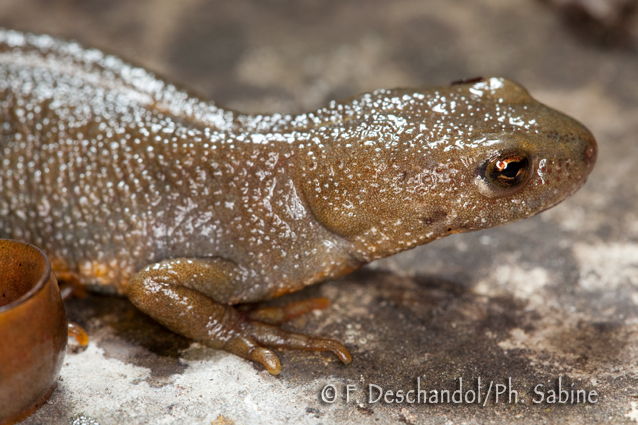 : Triton crêté italien (Triturus carnifex), femelle, Veigy (74), France.